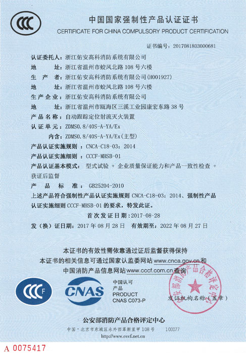 產(chǎn)品執(zhí)行標準號:GB25204-2010 額定流量:40L/s 額定工作壓力:0.8MPa 最大保護半徑:60m 定位時間:≤60s 水平回轉(zhuǎn)角:360° 俯仰角是小范圍:-90°~+30°